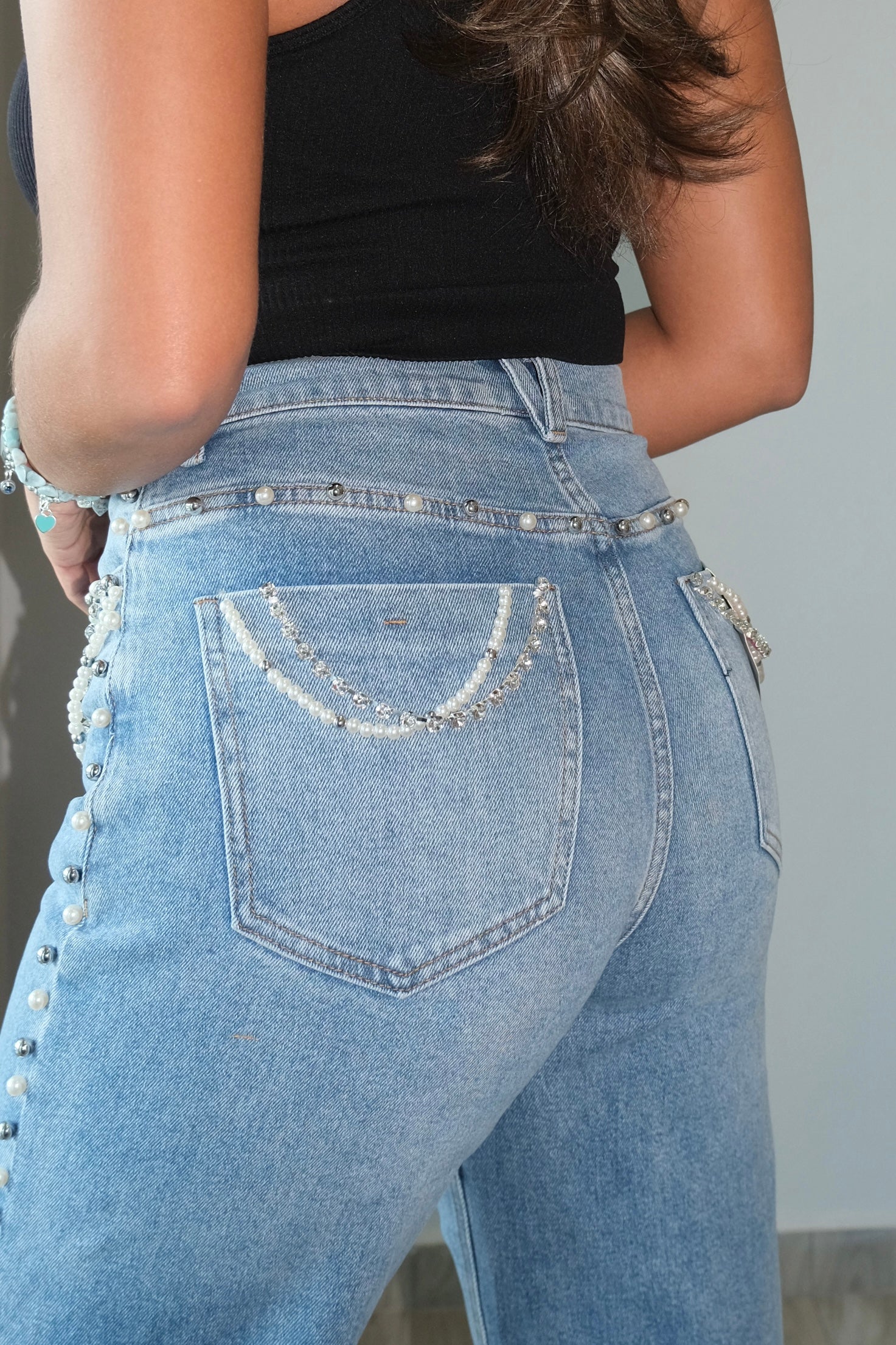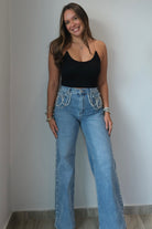 Elevate your holiday style with these Ariana Tear Drop Rhinestone Wide Leg Jeans. The vibrant rhinestone, pearl, and stud details add a touch of glamour to the high-rise and classic 5-pocket design. Made with 99% cotton and 1% spandex, these jeans provide both comfort and style. Available in true sizes, as seen on the model wearing a size 3.