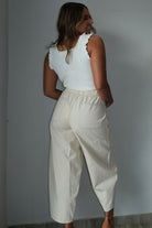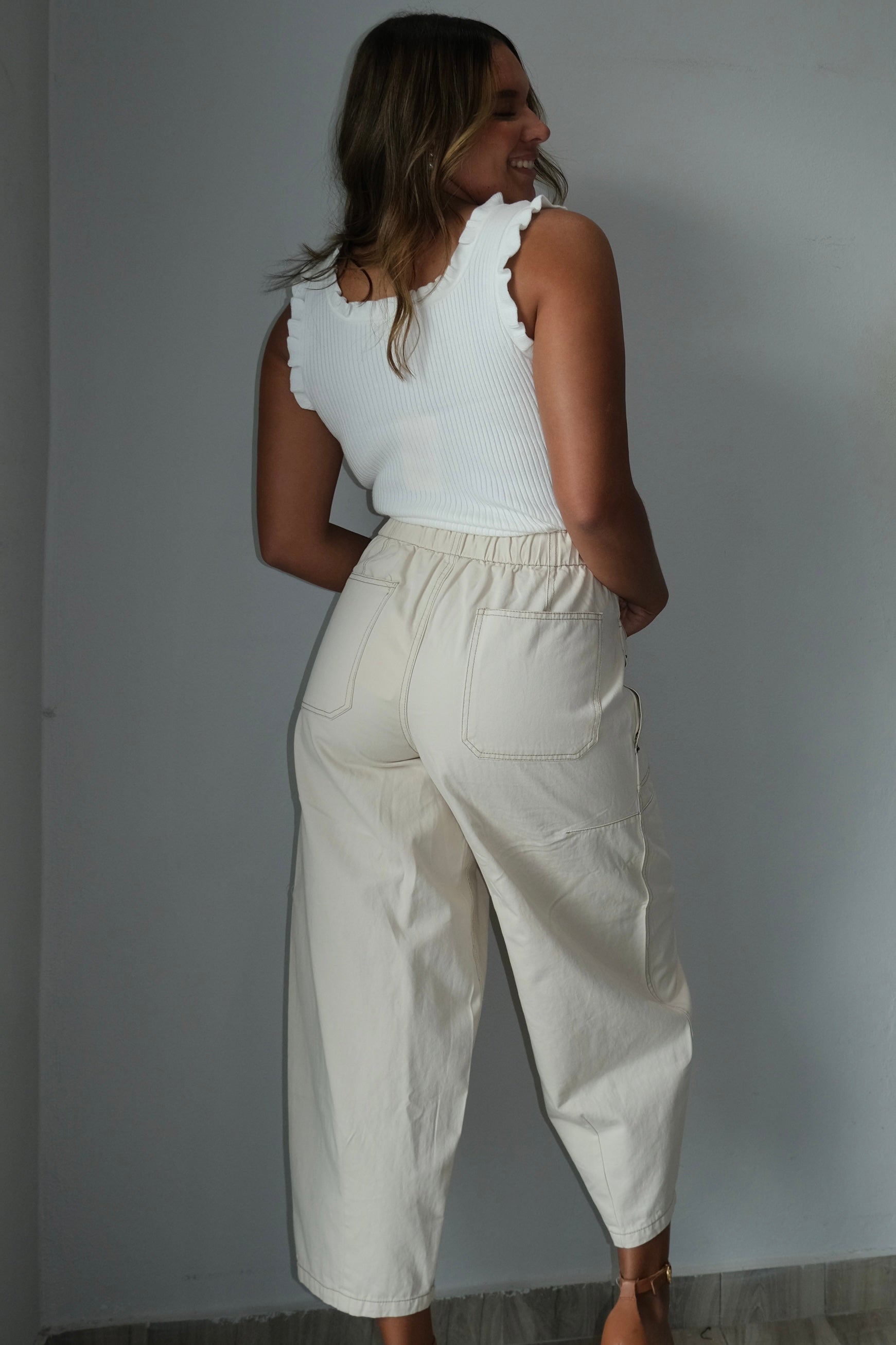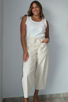 These Gina Contrast Stitch Barrel Pants feature premium 100% cotton construction with distinctive contrast stitching. The design includes multiple functional pockets and an elastic waistband at the back for optimal comfort and fit. The pants run true to size, as demonstrated by our model who wears a size small. A versatile addition to any wardrobe that balances style with practicality.