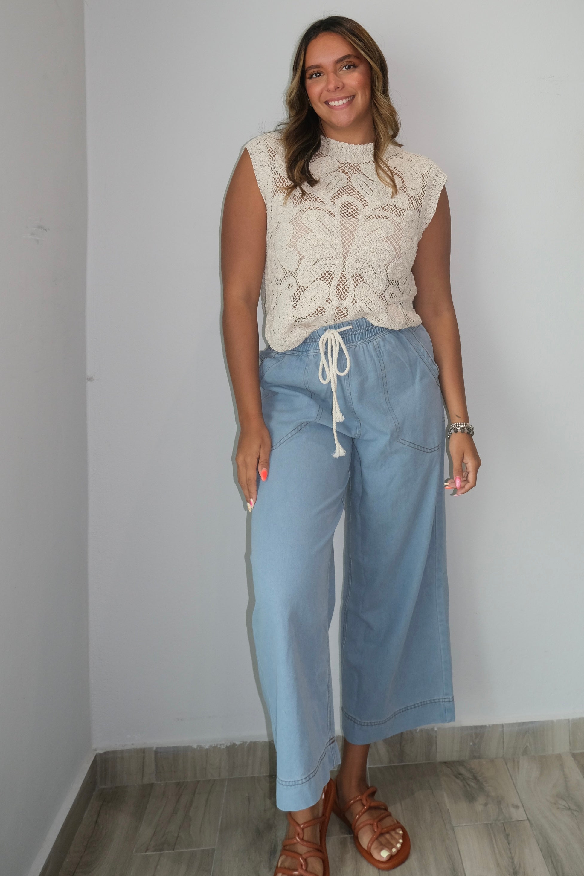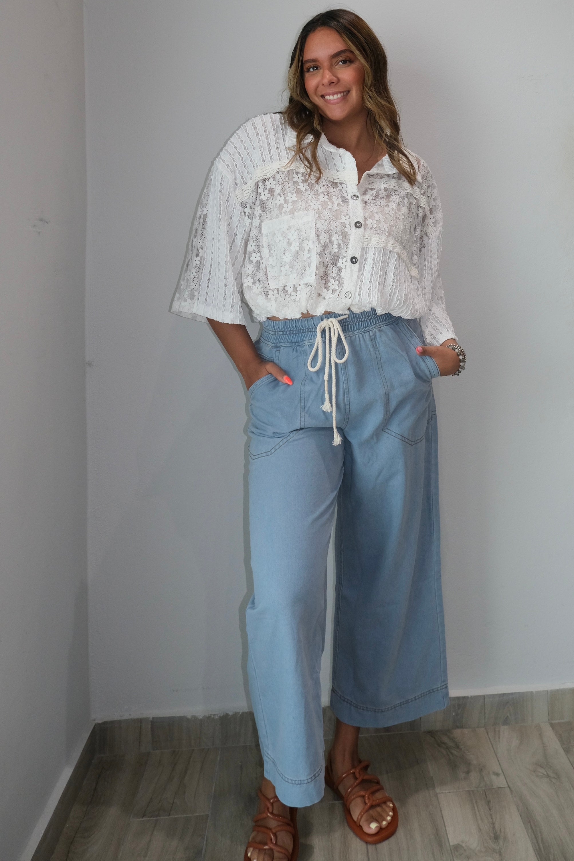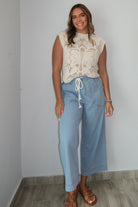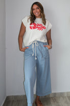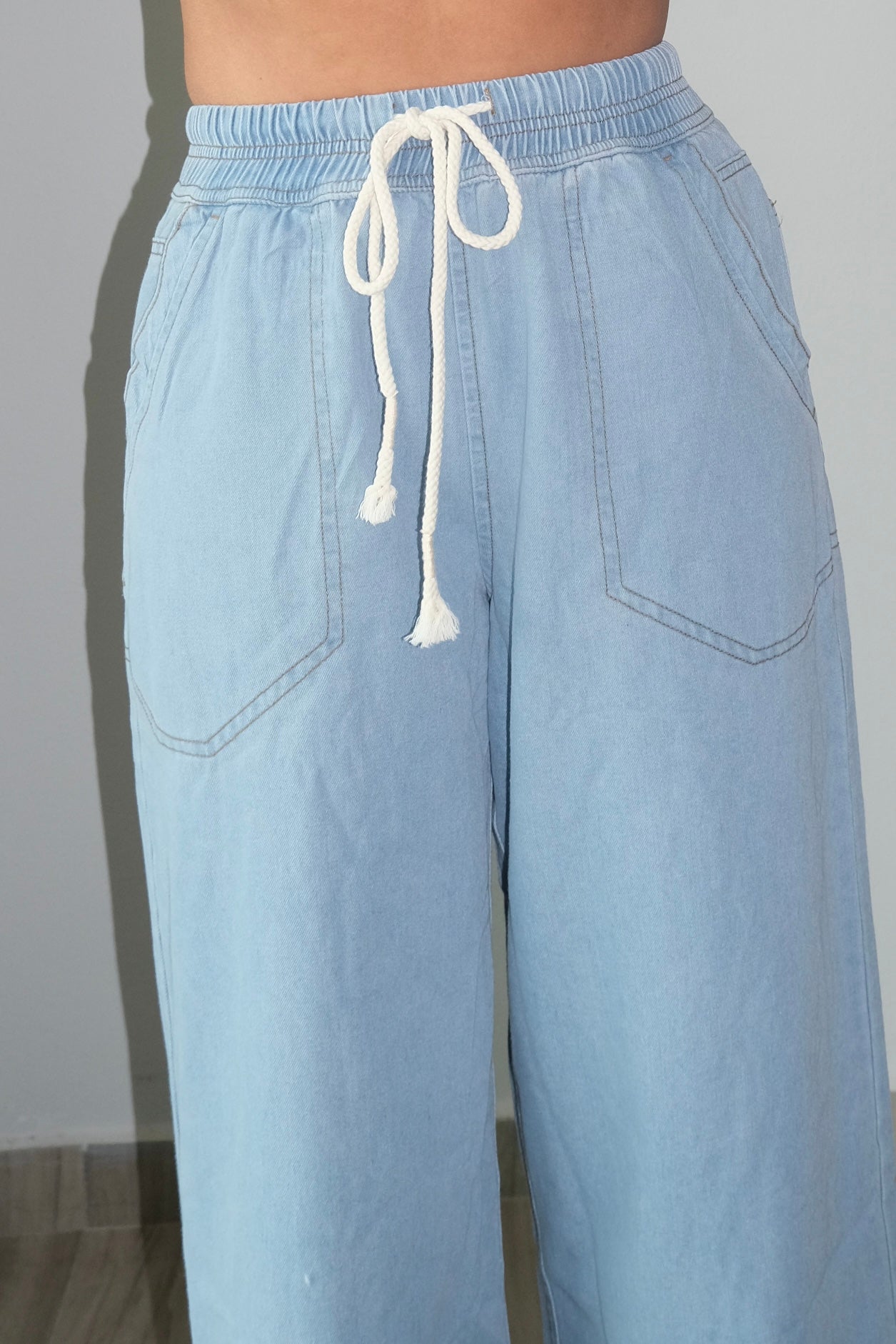 The Kaia Wide Leg Jeans are crafted from a blend of 80% cotton and 20% polyester, offering durability and comfort. These solid high-waist pants feature a wide-leg, ankle-length design with exposed stitching on the front pockets for subtle detailing. The drawstring elasticated waistband provides an adjustable fit, ensuring comfort throughout the day. Designed to run true to size and model is wearing a size small, these jeans combine style and practicality for versatile wear.
