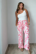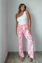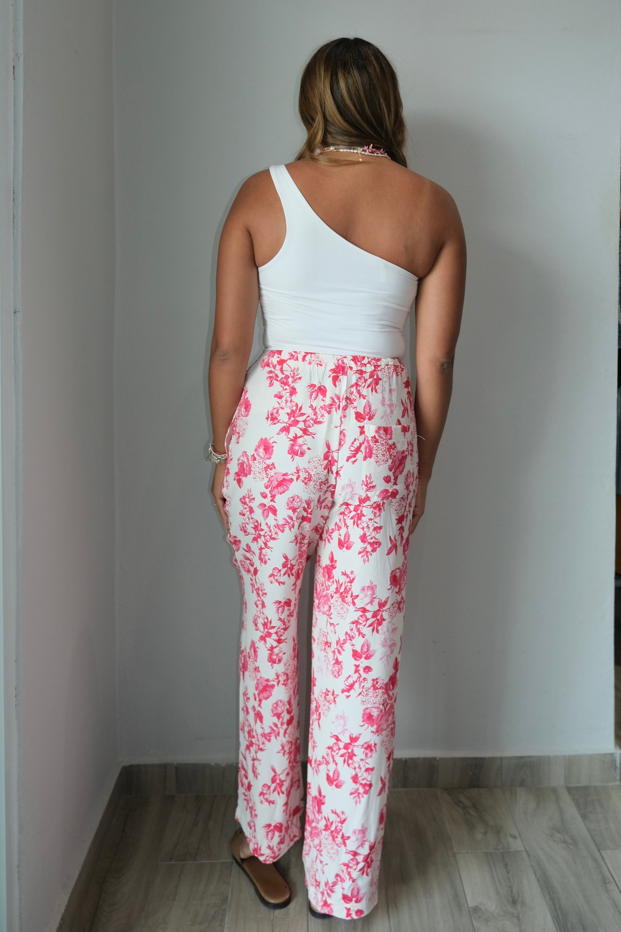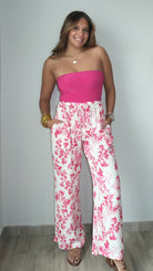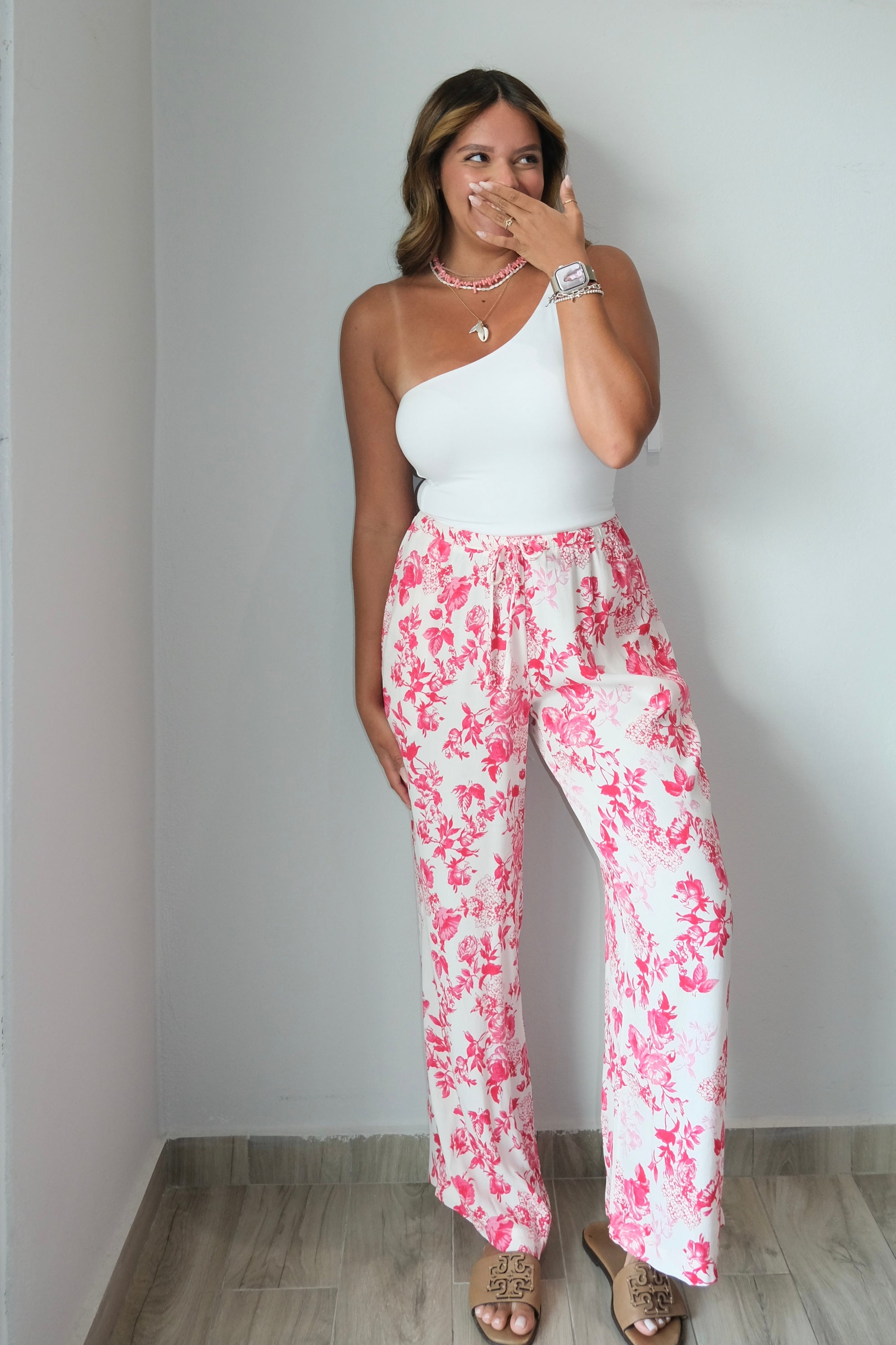 Introducing our Lyla Palazo Pants, featuring a drawstring waist and pocket for convenience. Made with a woven fabric blend of 50% viscose and 50% rayon, these pants are comfortable and run true to size. Our model, standing at 5'6, wears a size small. Elevate your wardrobe with these stylish and practical pants. Get the full outfit with our ONE SHOULDER BASIC TANK in white.
