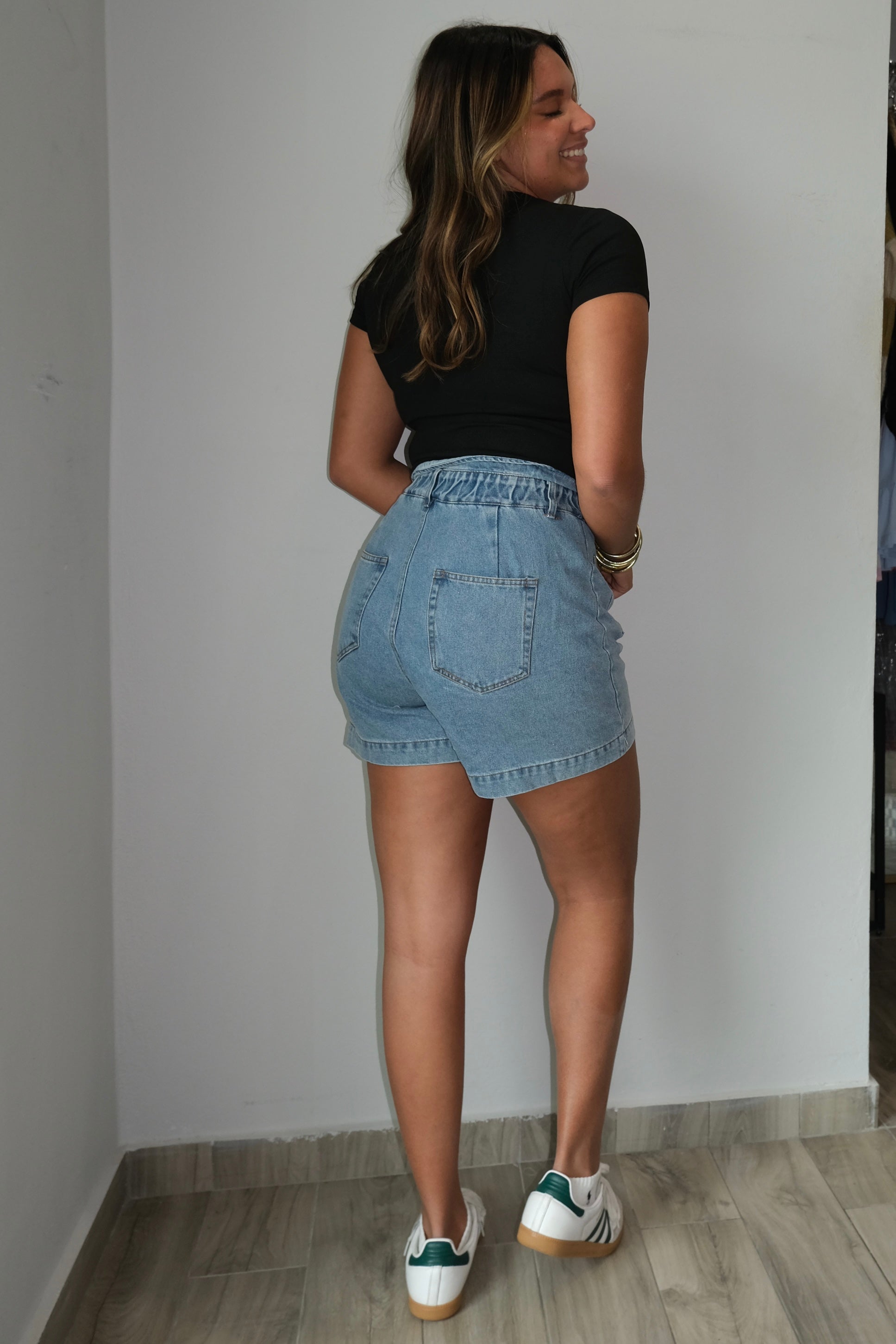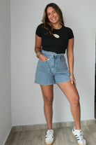 These Misty Highwaisted Mom Shorts are made from a blend of 80% cotton and 20% polyester, providing both comfort and durability. Designed to run true to size, and the model is wearing a size small. Perfect for any casual outfit, these shorts are a must-have for any wardrobe.