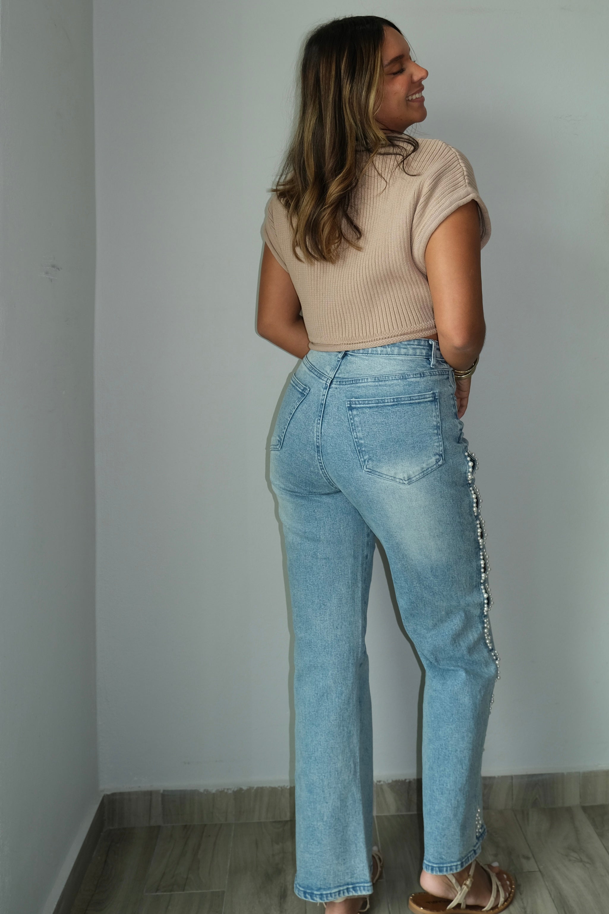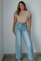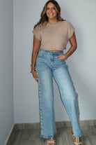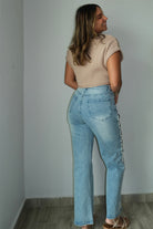 Experience ultimate comfort and style with our Pearl Stud Cut Out Jeans. Made from a blend of 98% cotton and 2% spandex, these jeans are perfect for any occasion. Featuring a straight leg design and running true to size, these jeans are a must-have for any wardrobe. Model is wearing a small.