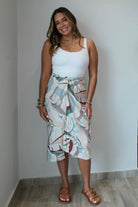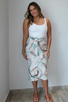 This Rae Tropical Print Midi Skirt runs true to size and can be easily wrapped in different ways, making it a versatile addition to your wardrobe. The model is wearing a size small and showcasing the benefits of this stylish and comfortable skirt. Upgrade your style with this must-have piece.