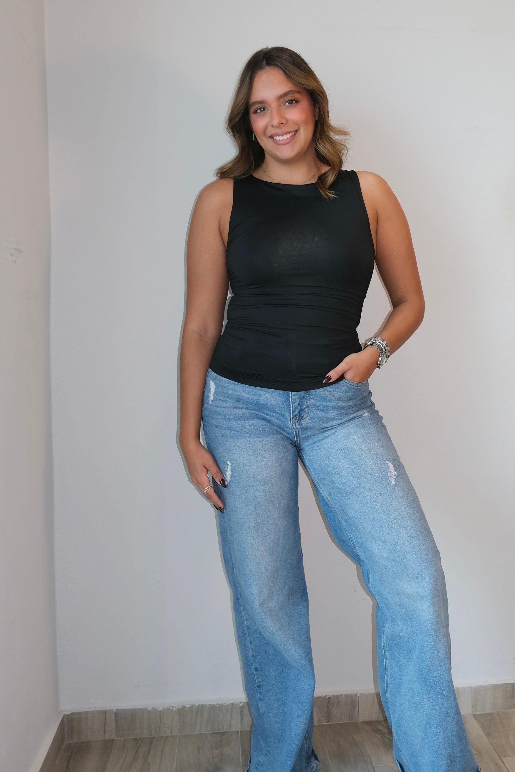 The Marlene Basic Tank Top is a must-have addition to your wardrobe. Made with 3 layers of bathing suit material, it offers durability and comfort. The tank top runs true to size and the model is wearing a small. Perfect for any occasion, it effortlessly combines style and functionality.