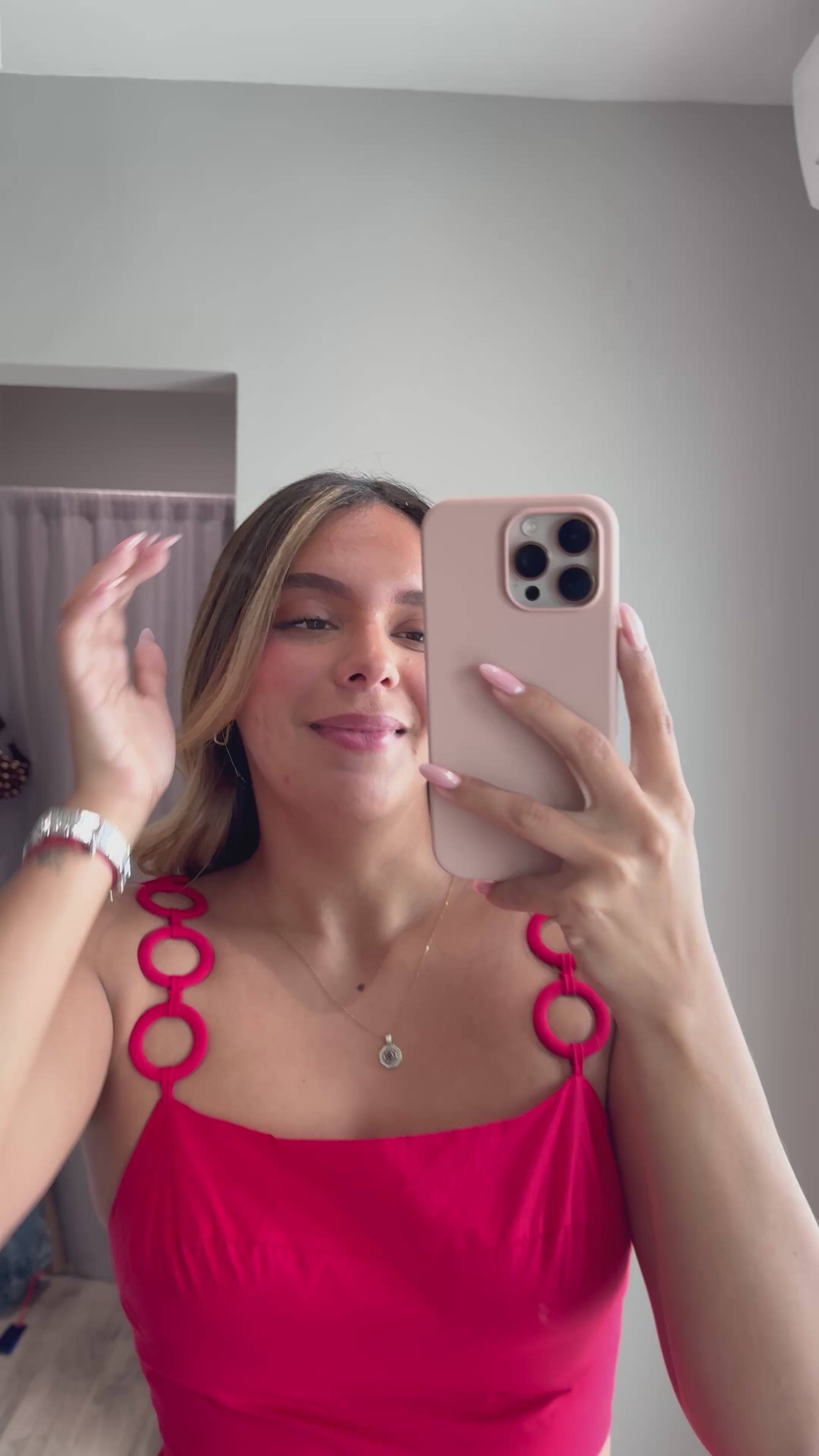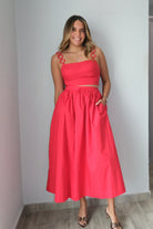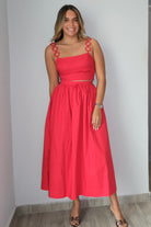 The Eugenia Ring Strapped Top & Midi Skirt Set combines comfort with effortless style. Made from 100% cotton, this two-piece set features a ring-strapped top paired with a midi skirt. The skirt includes an elastic waistband and functional pockets for everyday convenience. The smocked back detail adds visual interest and a flattering fit. This set runs true to size, with our model wearing a small. Perfect for casual outings or relaxed days at home.