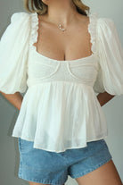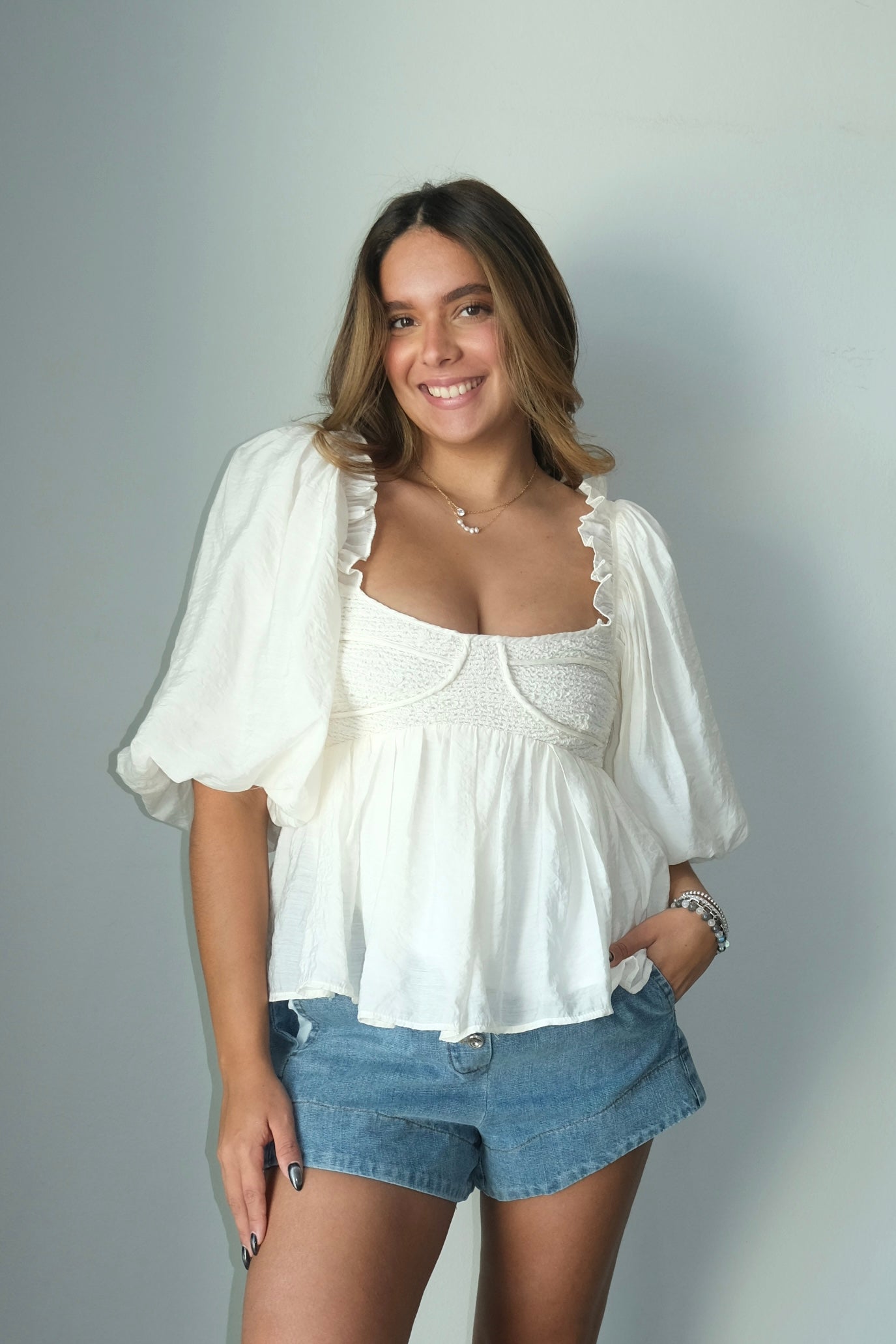 The Holly Smocked Puffed Sleeve Blouse combines timeless elegance with contemporary style. Featuring delicate smocking detail and voluminous puffed sleeves, this piece offers a refined silhouette that transitions seamlessly from casual to dressy occasions. The blouse runs true to size, ensuring a perfect fit—our model wears a size small. Crafted for versatility, it pairs effortlessly with jeans, skirts, or tailored trousers for an instantly polished look.