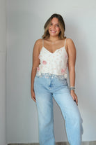 The Pearl Floral Sequin Mesh Top offers an impeccable fit, running true to size for confident styling. The model is shown wearing a size small, illustrating its precise tailoring. If you're between sizes, sizing up ensures optimal comfort without compromising the sleek silhouette. This top combines delicate floral sequins with breathable mesh, making it perfect for elegant occasions with ease.