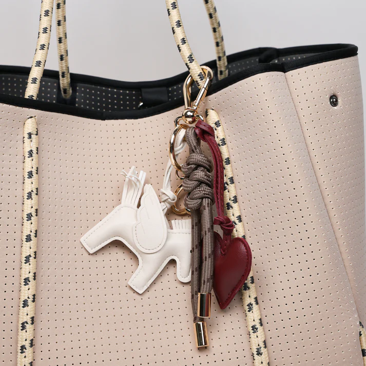 KEY CHAIN MOCHA WITH CHARMS - WHITE FLYING HORSE AND BURGUNDY HEART