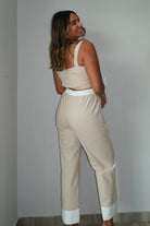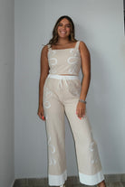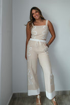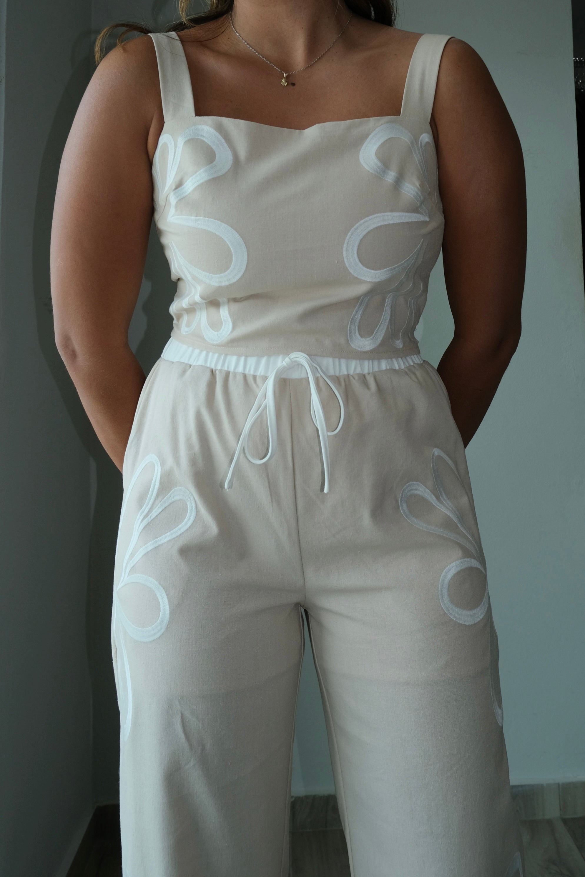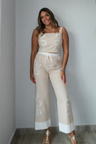 This set features a floral embroidery on both the sleeveless top and contrasted hem pants, adding a touch of elegance to the 70% cotton and 30% linen fabric. With a true-to-size fit and a model wearing a size small, this set is perfect for any occasion.