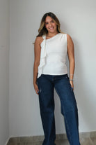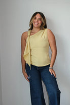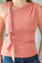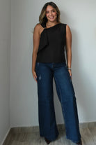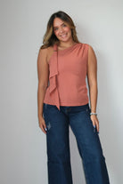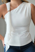 Effortlessly elevate any outfit with our Gaia Asymmetrical Drape Ring Detailed Top. Our model is wearing a size small, showcasing the true-to-size fit. The invisible zipper adds a touch of sophistication, while the non-stretch fabric maintains its shape. For a more comfortable fit, we recommend sizing up if in between sizes.
