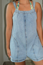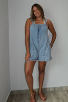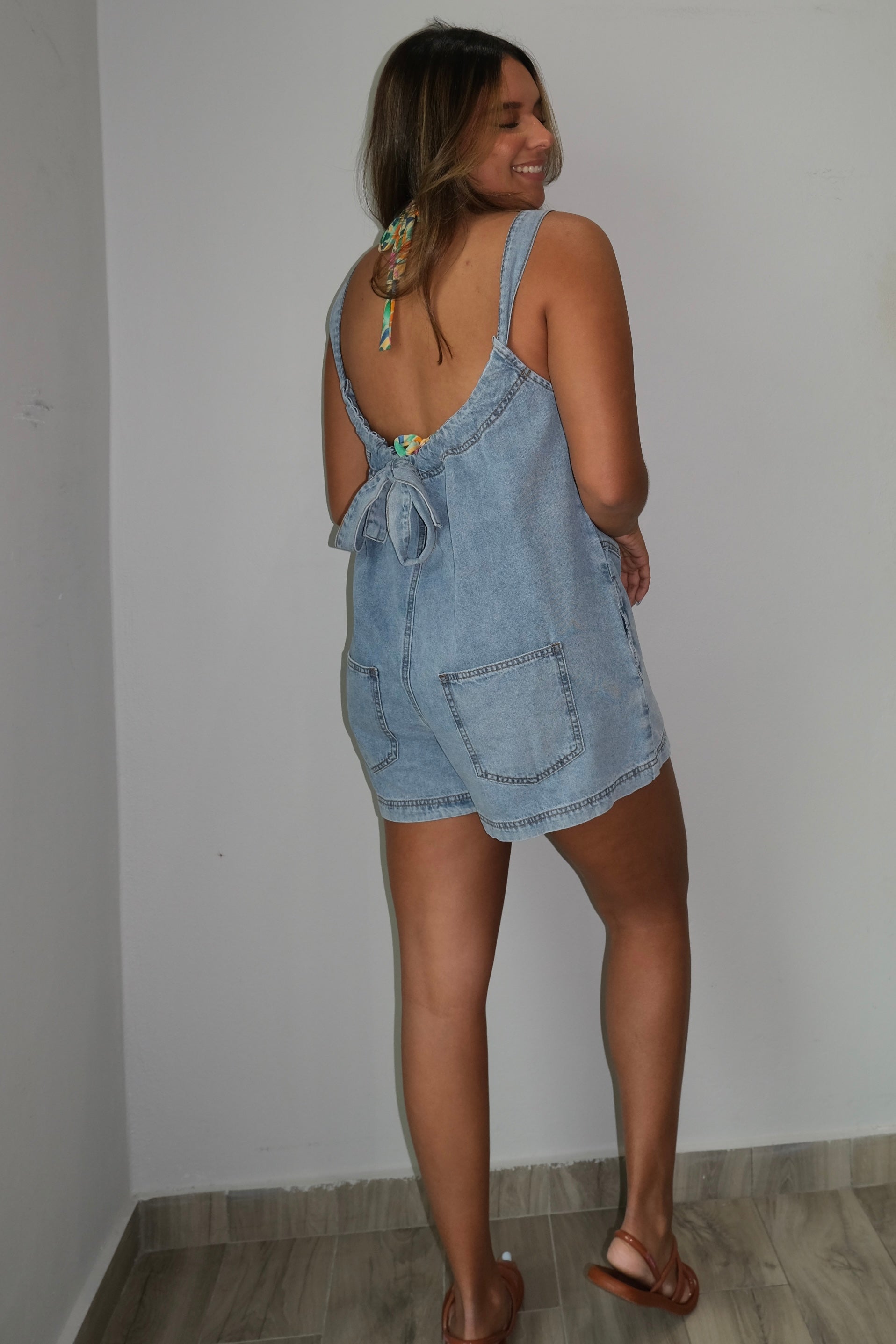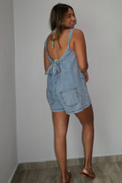This Harlow Denim Back Tie Romper features a drawstring open back and self bow tie detail, making it a stylish and versatile addition to your wardrobe. Made from comfortable cotton, this romper runs true to size and is perfect for any occasion. Expertly modeled in a size small.