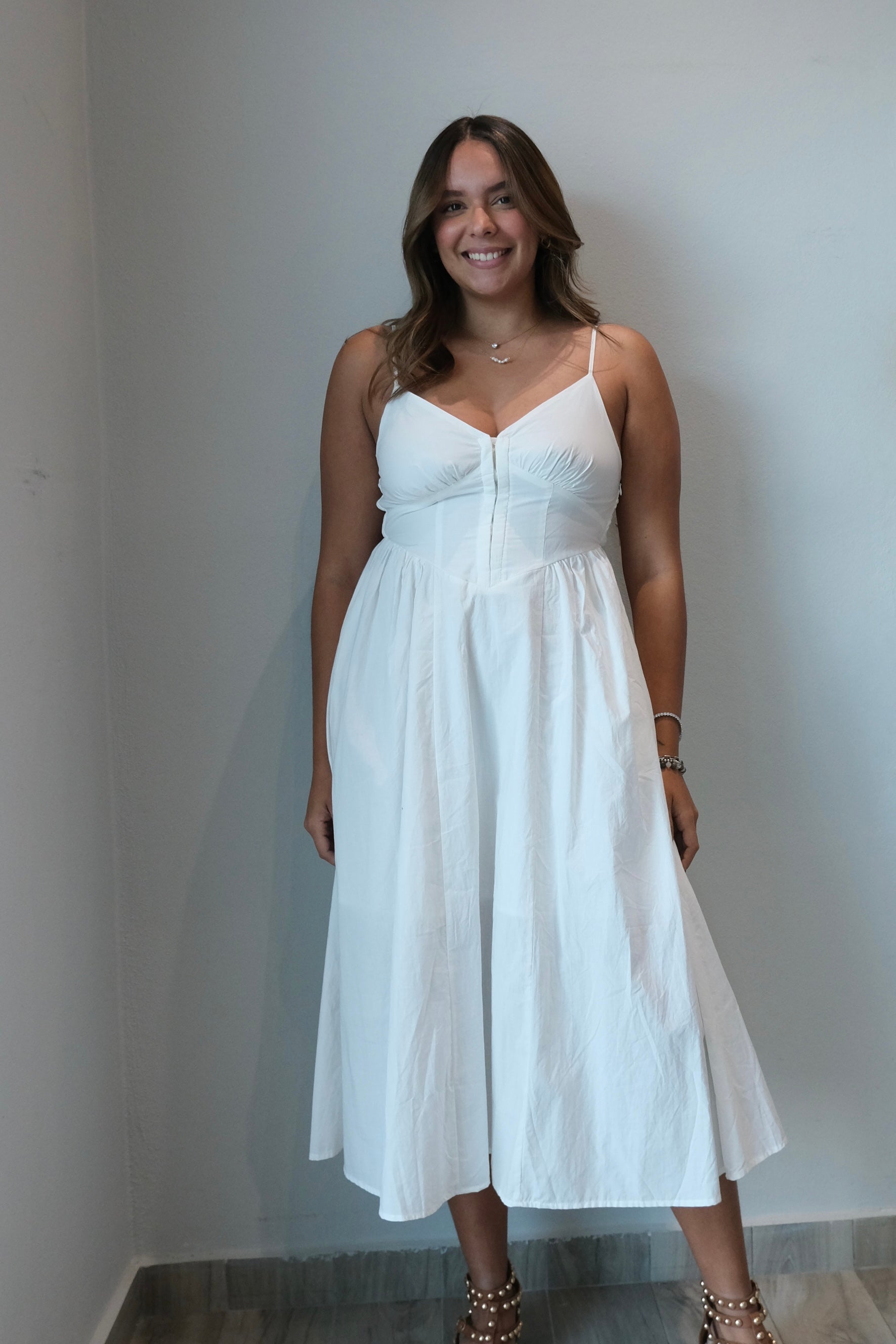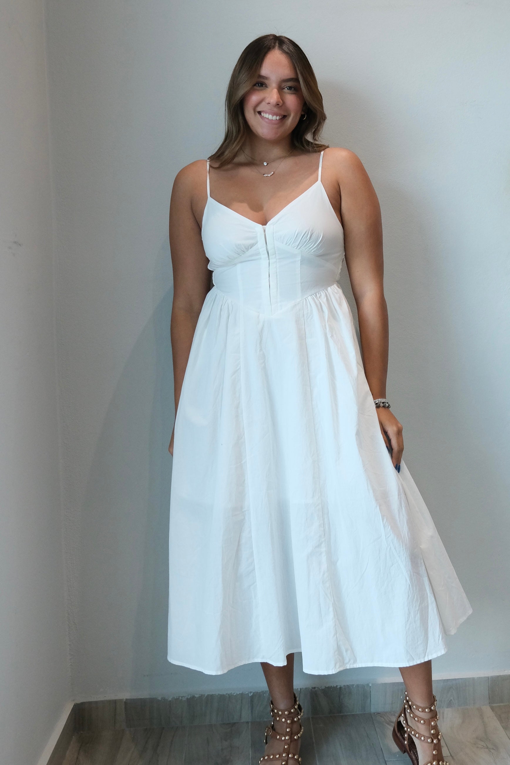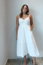 The Millie Corset Midi Dress offers both style and comfort. Designed to fit true to size, this dress features a flattering corset look, complete with a smocked back for a perfect fit. With the added convenience of pockets, it's the perfect blend of fashion and functionality. Expertly crafted for a stunning look. Model is wearing small.