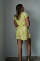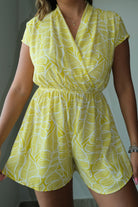 Enhance your summer wardrobe with the Naya Tropical Print Surplice Romper. Featuring an elastic waistband, this romper offers a comfortable and flattering fit. Made of lightweight polyester, it is perfect for warm weather. Designed to run true to size, it is modeled here in a size small.