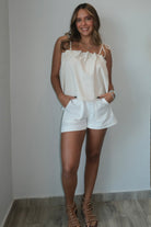 Expertly crafted from a blend of 40% linen, 40% viscose, 10% polyester, and 10% cotton, the Romee Pearl Embellished Linen Top offers both comfort and style. The elastic band provides a perfect fit, while the running true to size. Please note that depending on your bust size, the front may appear shorter. Dress like a model with size small.