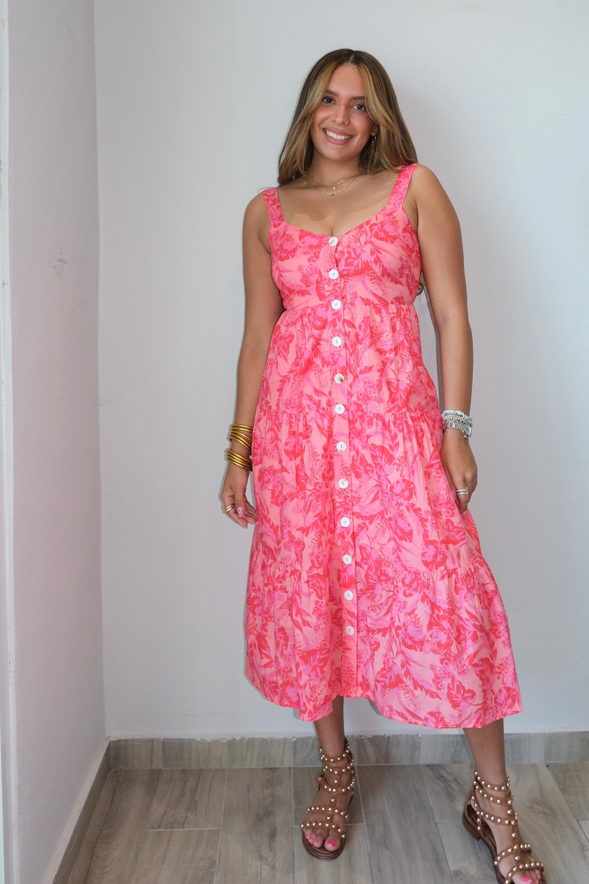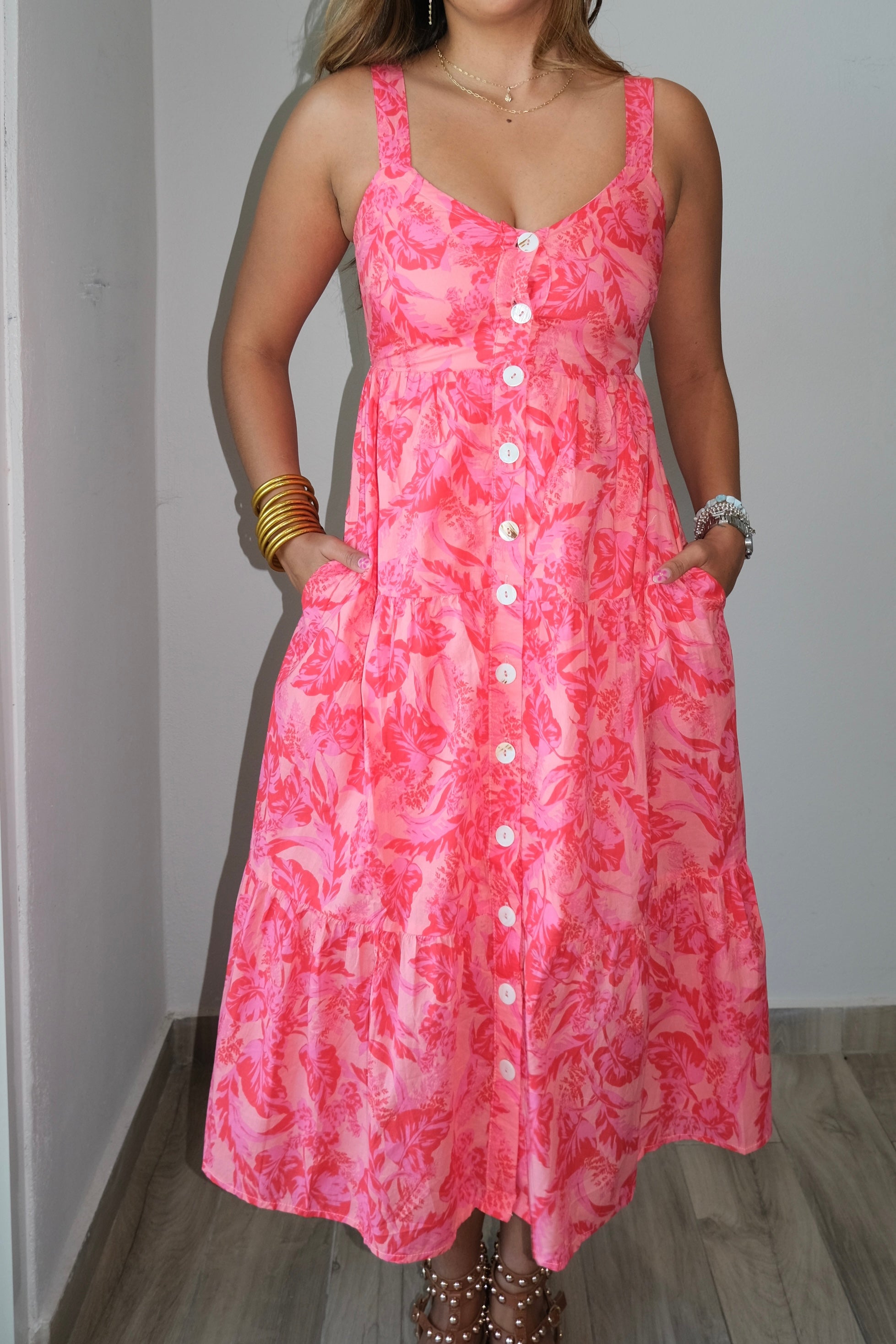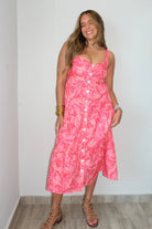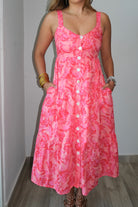 This Gigi Button Down Midi Dress boasts a smocked back and convenient pockets, perfect for a comfortable and stylish look. Made from 100% cotton, it runs true to size and is currently modeled by a size small. Elevate your wardrobe with this timeless piece.