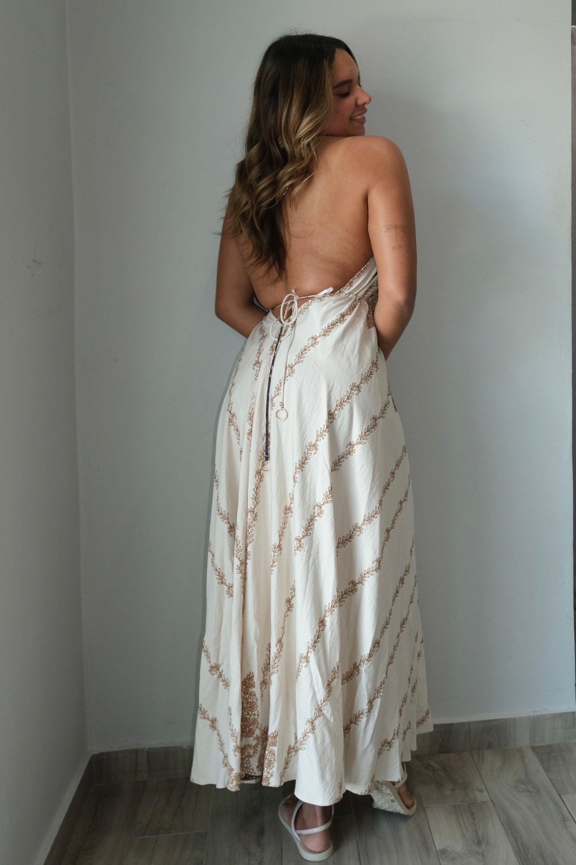 Effortlessly chic and flattering, the Lenora Halter Backless Tie Dress features a bold halter neckline and open back design for a modern, daring look. Crafted from a luxurious blend of 90% rayon and 10% nylon, this dress drapes beautifully with a soft, fluid feel. Runs true to size—our model wears a small. If you prefer a more fitted silhouette, consider sizing down. Perfect for date nights, special occasions, or whenever you want to make a statement.