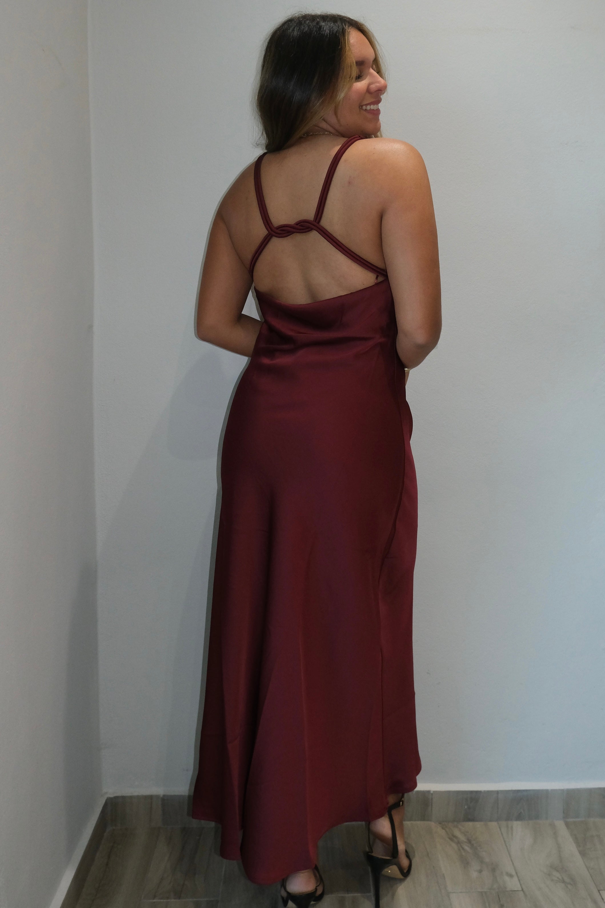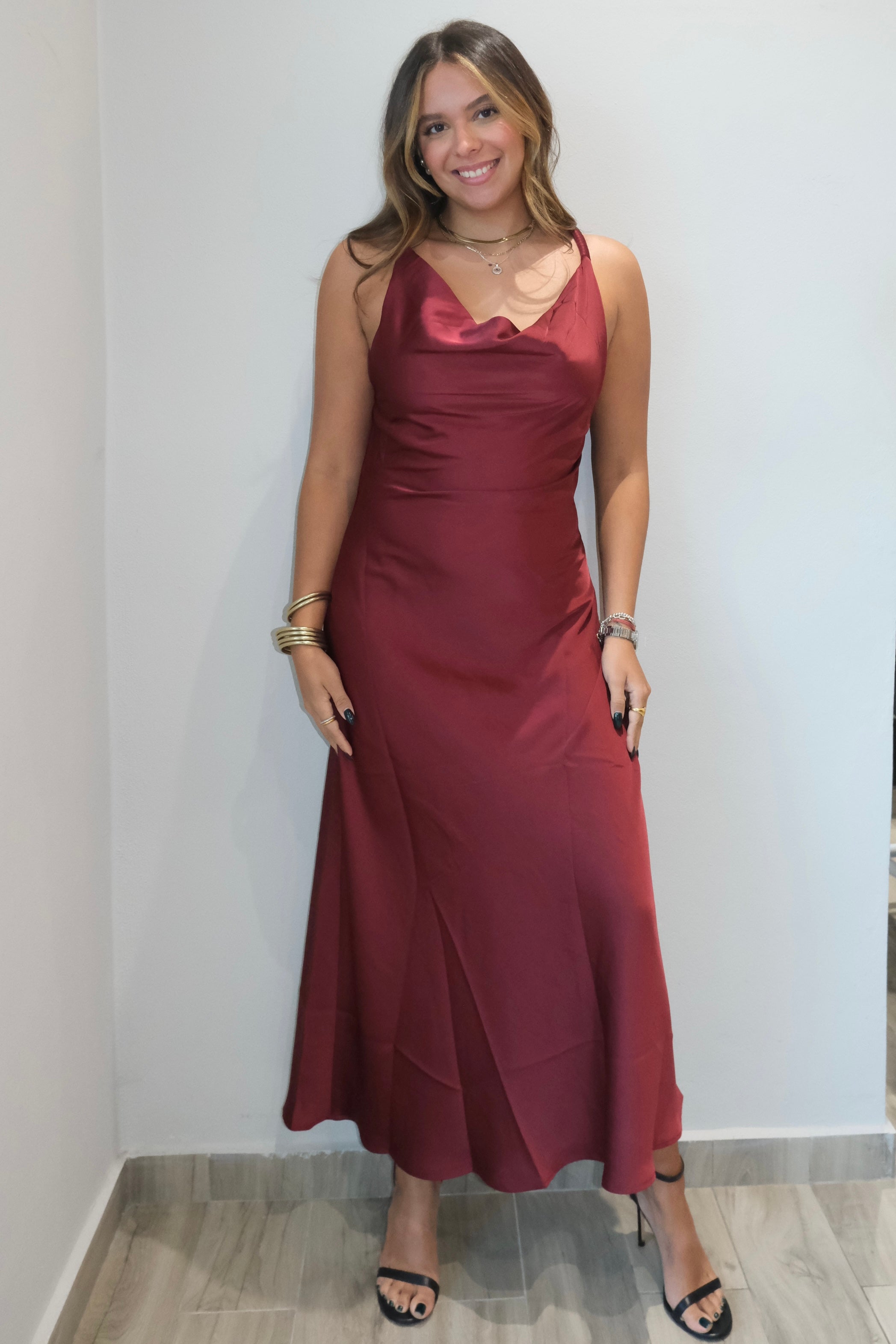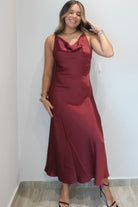 Effortlessly chic, the Sophia Twist & Shout Maxi Dress features a cowl neck and a slip on design. The round cord shoulder straps and twisted X back straps add a touch of trendy detail, while the cowl back and self fabric lining provide comfort and style. Made with 100% polyester, this dress is both fashionable and comfortable. Runs true to size. Model is wearing size small.