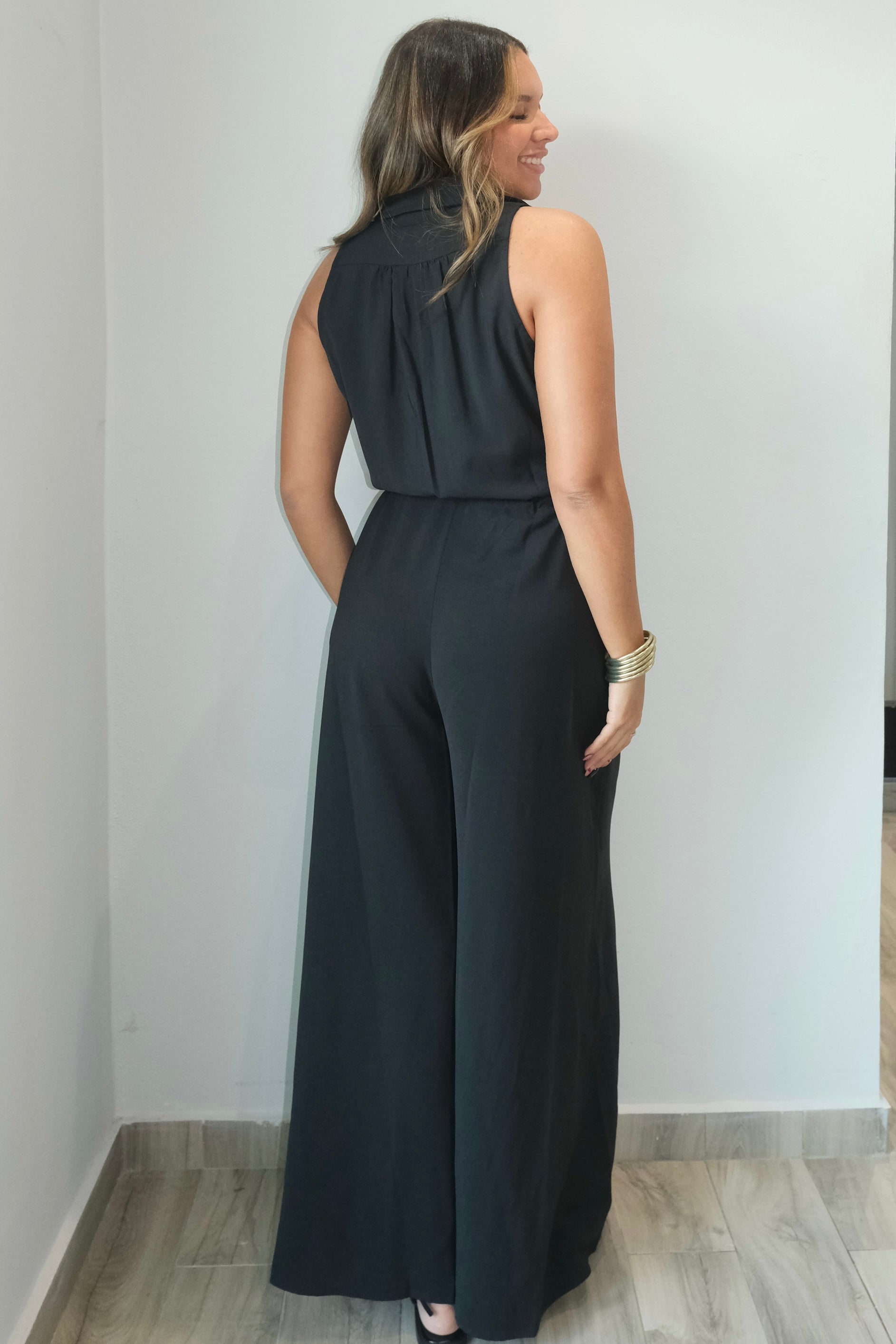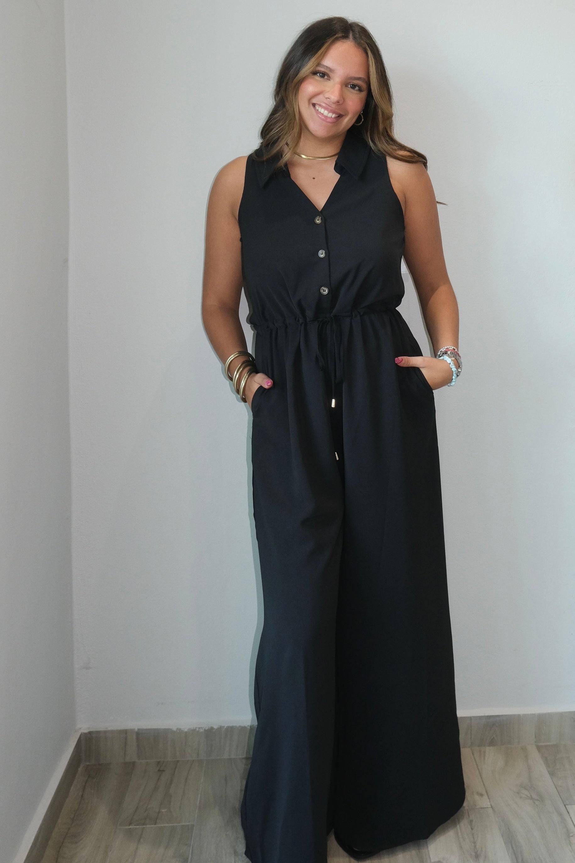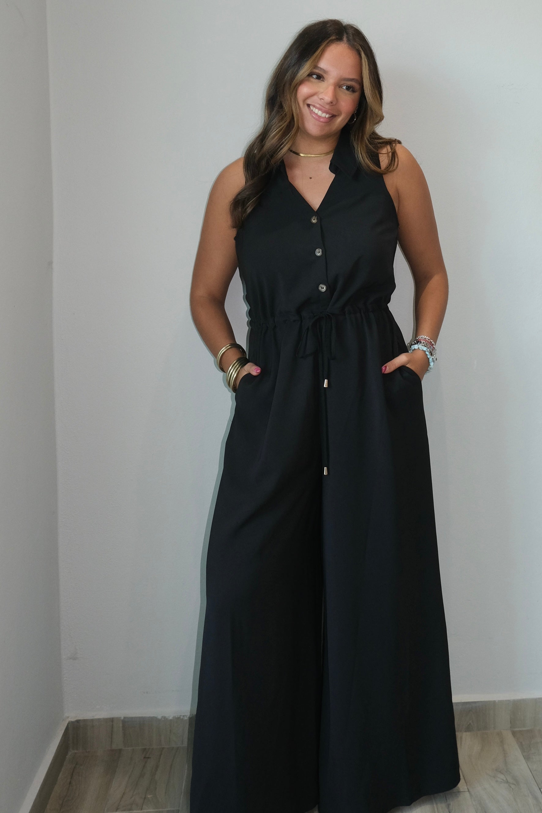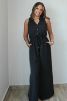 Expertly crafted with a sleeveless design, button-down closure, and waist tie, the Farah Jumpsuit exudes effortless style. Featuring convenient pockets and a true-to-size fit, this jumpsuit is versatile and perfect for any occasion. Embrace comfort and fashion with our must-have piece, as showcased by our model in a size small.