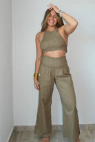 The Kailani Pearled Smocked Top & Pants are crafted from 100% cotton, offering a comfortable and breathable wear. The smocked waist and pearl drawstring add a touch of elegant detail to this versatile outfit. With a true to size fit, it's perfect for any occasion. Model is wearing a size small.