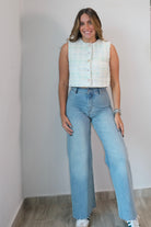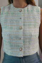 Frankie Tweed Jewel Button Vest Top This classic tweed vest top features elegant jewel buttons and a timeless design. True to size with no stretch, so if you're between sizes, we recommend sizing up. Model pictured wears a small. Perfect for layering or wearing solo, this piece adds sophistication to any outfit.