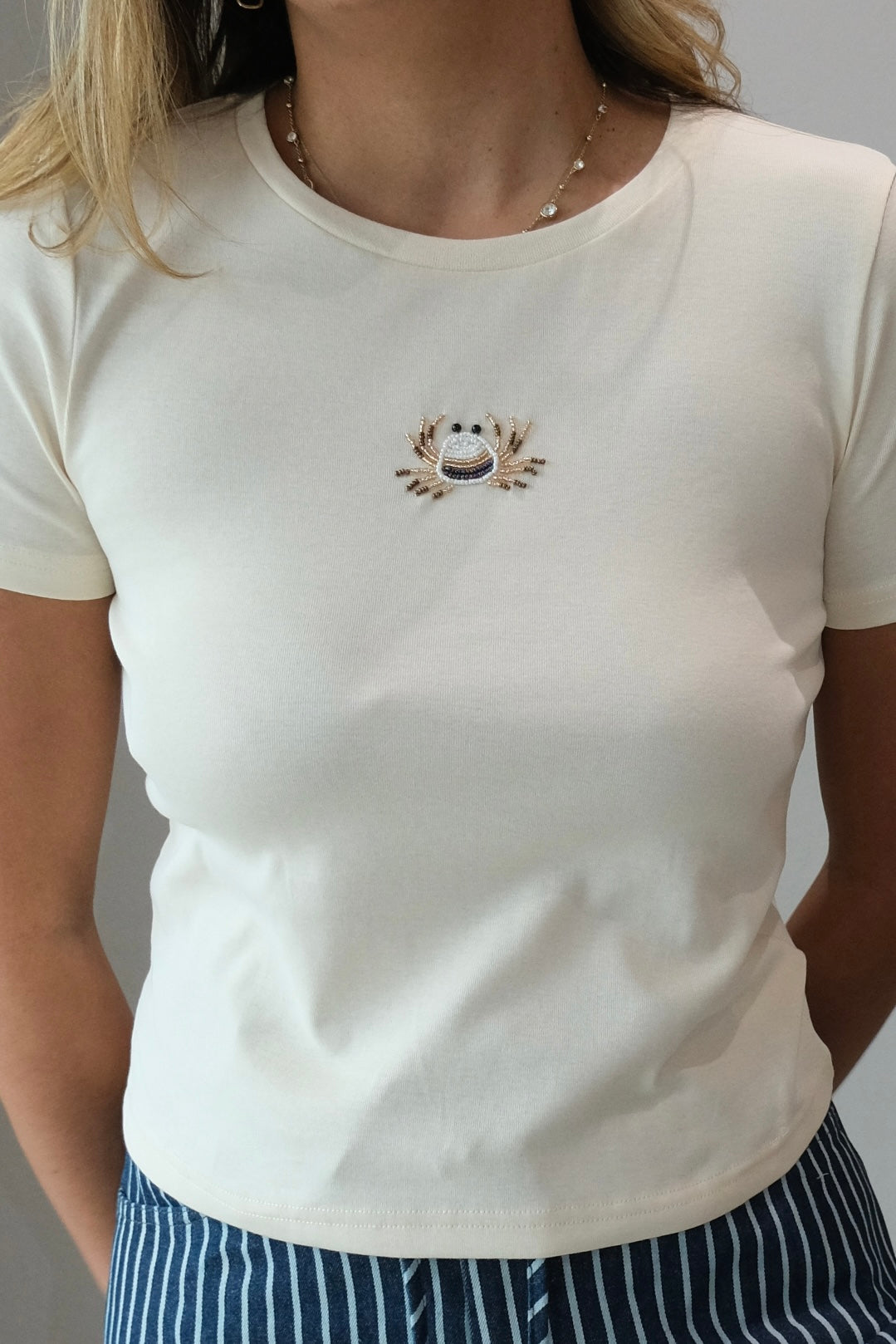 Lottie Embroidered Beaded Crab T-Shirt This comfortable tee features a charming embroidered and beaded crab design that adds personality to your everyday wardrobe. Made from a soft cotton-blend fabric with just the right amount of stretch, it moves with you throughout the day. The 92% cotton and 8% spandex blend keeps its shape while providing flexibility. Runs true to size for an easy fit. Our model wears a size small.