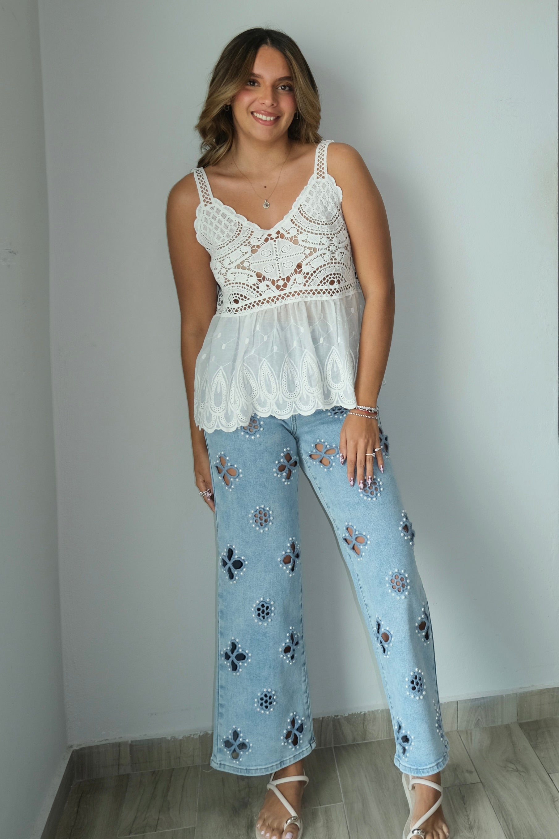 Lucie Pearl Stud High Rise Jeans feature a comfortable high rise cut with pearl stud detailing for a touch of elegance. Made from a soft cotton blend with stretch, these jeans run true to size and move with you all day. The fabric is 92% cotton, 6% polyester, and 2% spandex, giving you durability and flexibility. The model is wearing size 3. Perfect for everyday wear with a polished finish.