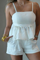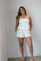This Nellie Linen Contrast Stitch Top & Short Set is a must-have for any wardrobe. With a smocked back and elastic waistband on the shorts, you'll have a comfortable and flattering fit. The set runs true to size and is perfect for any occasion. Model is wearing a small.