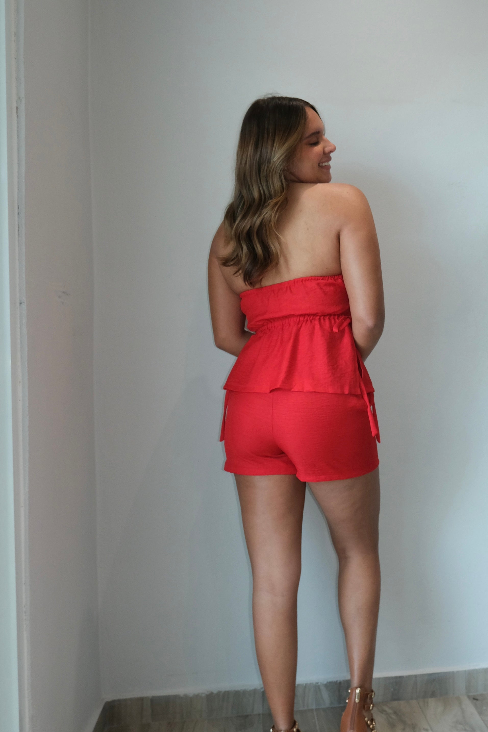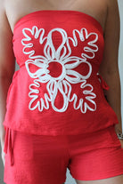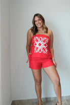 This Ruby Embroidered Top & Short Set is made with comfortable spandex on the back of the top. The set runs true to size, providing a perfect fit for all body types. The model is wearing a size small, showcasing the versatile sizing options for this set.