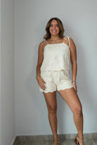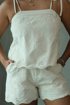 Crafted from 100% cotton, the Sky Floral Embroidered Top & Short Set offers breathable comfort and durability. Designed to run true to size, it ensures a precise fit for effortless styling. The model wears a size small, highlighting the set’s flattering silhouette and intricate floral embroidery, perfect for a refined yet casual look.