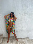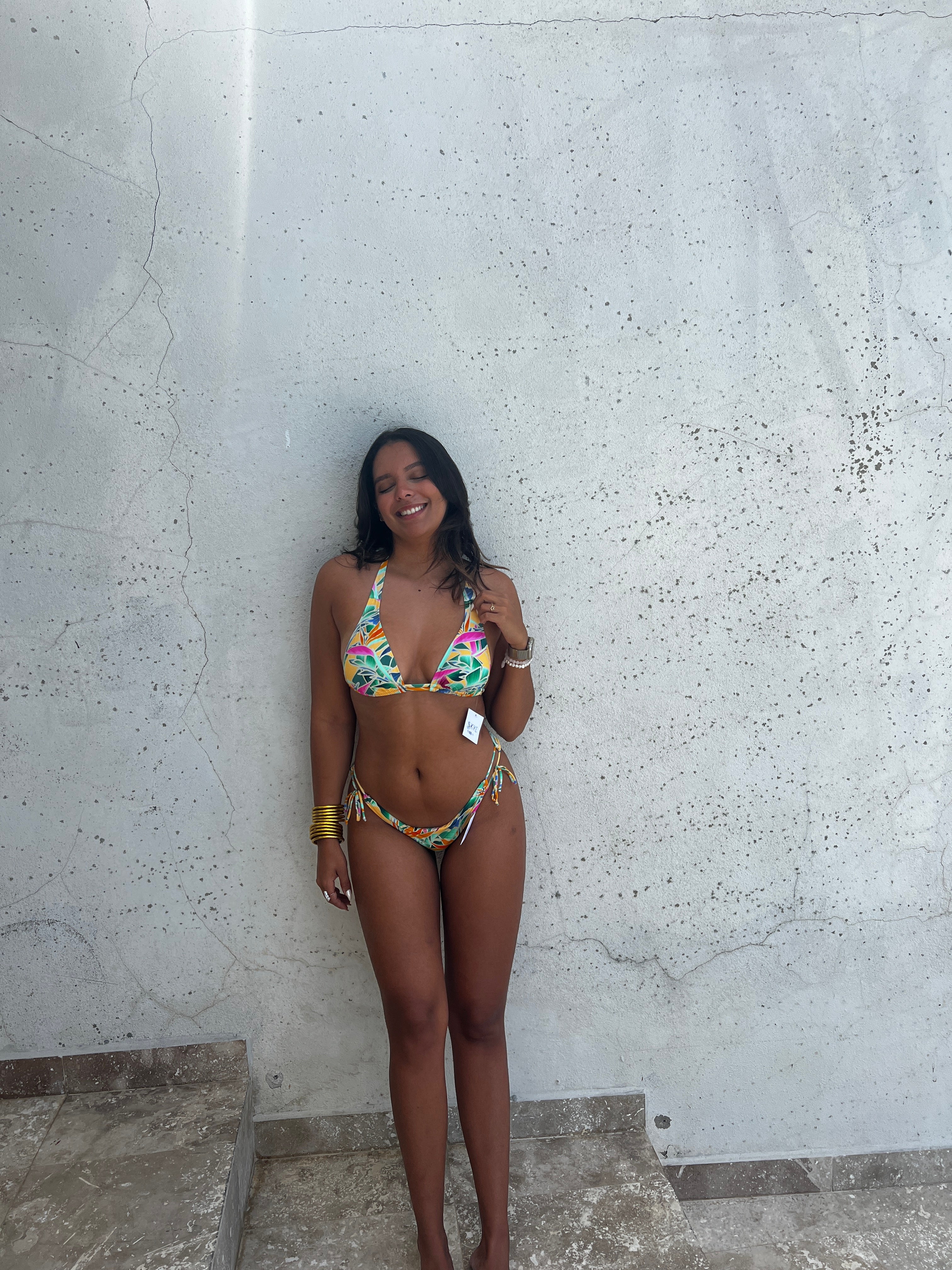 Présentation de MADÈRE ; un maillot de bain deux pièces avec un haut triangle à large bande offrant des bonnets souples amovibles, un large élastique sous la poitrine, des bretelles réglables et un lien à nouer au dos. Le bas taille basse présente une finition épurée sur le devant avec des boucles avant réglables pour un ajustement confortable et sécurisé. Parfait pour les journées à la plage passées à profiter du soleil.