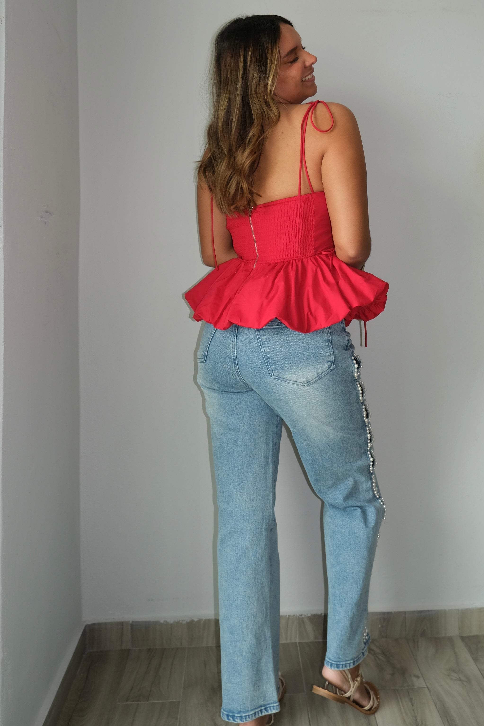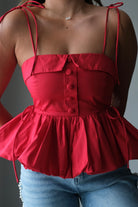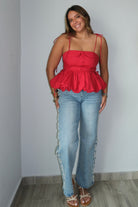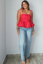 This Sofi Smocked Ruffled Blouse runs true to size and comes with a smocked back, adjustable straps and waist. This ensures a perfect fit and comfortable wear for any body type. The model is wearing a size small, showcasing the versatility and flattering look of this blouse.