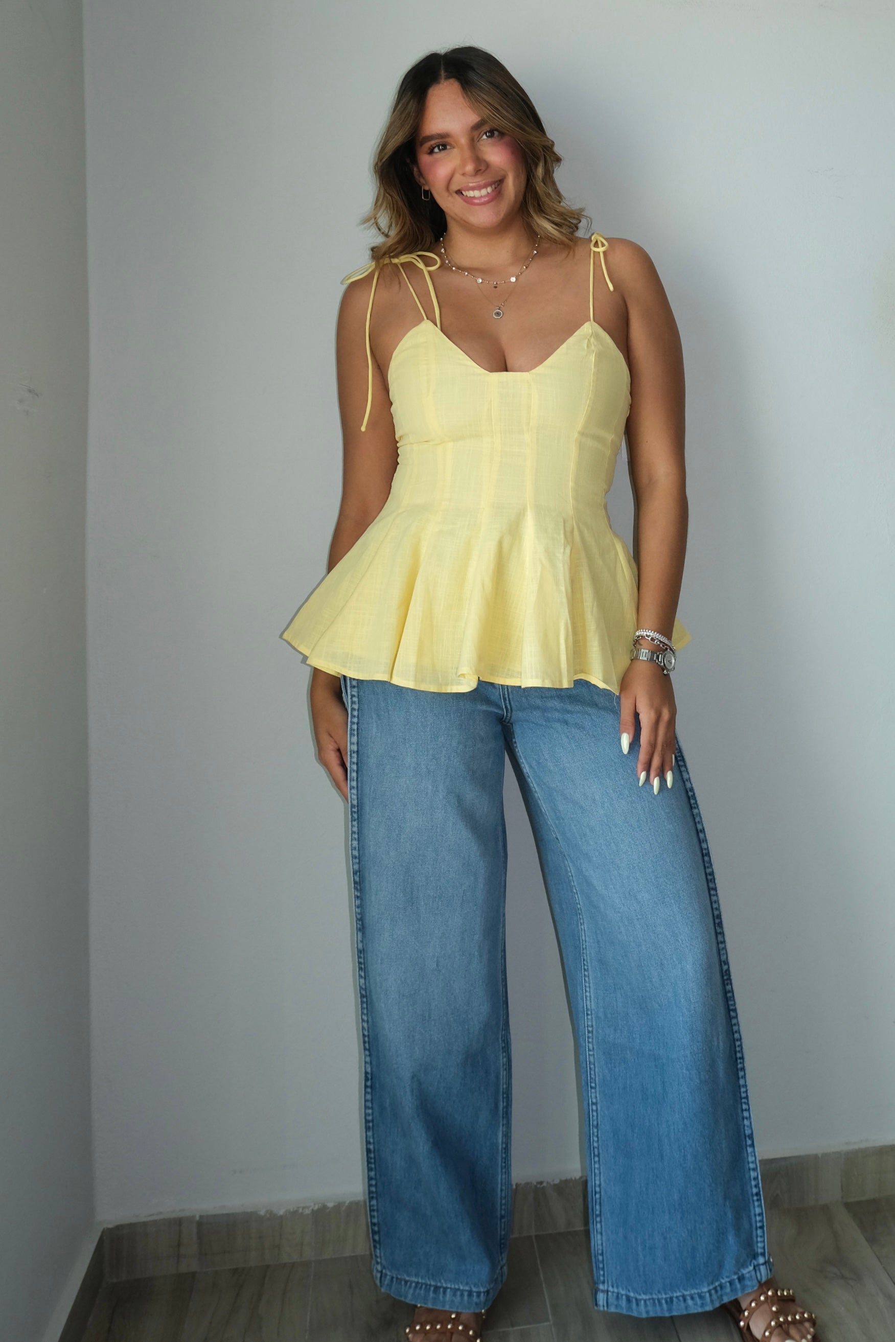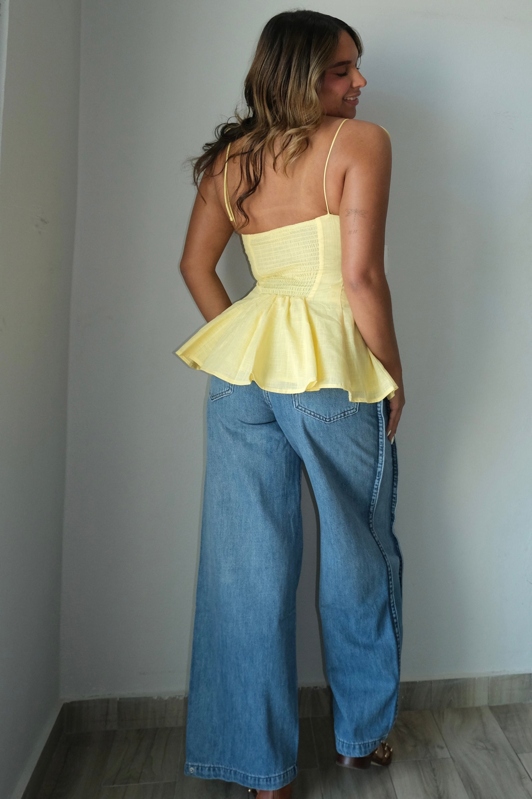 The Mara Shoulder Tie Peplum Top is a timeless piece crafted from 100% cotton for breathable comfort and durability. Featuring a charming shoulder tie detail and flattering peplum silhouette, this top adds feminine flair to any wardrobe. Runs true to size. The model pictured wears a size small, we recommend sizing up if you prefer a more relaxed fit or are between sizes.
