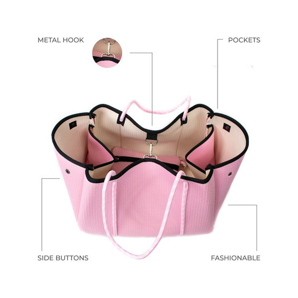 The Perfect Every Day Tote Bag is versatile, designed for multiple uses including work, gym, beach, and travel. Constructed from durable neoprene, it measures 21 inches in width, 11 inches in length, and 9 inches in height, offering ample space while maintaining lightweight portability.