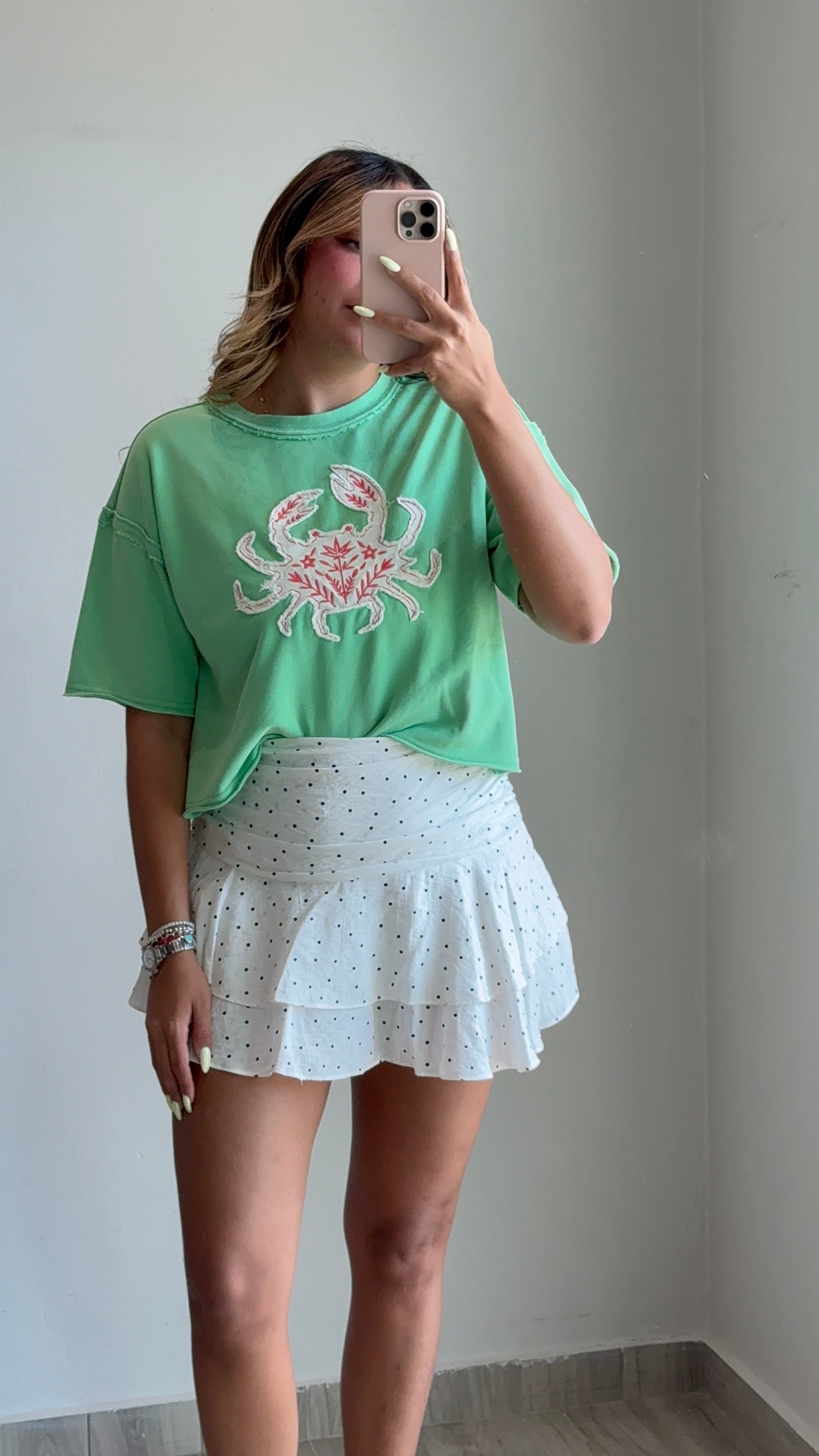Triana Washed Crab Embroidered Patch T-shirt runs true to size. Crafted from a comfortable blend of 85% cotton and 15% polyester, this tee offers the perfect balance of breathability and durability. The model pictured is wearing a size small. Featuring a charming embroidered crab patch detail, it's an effortless addition to your everyday wardrobe.